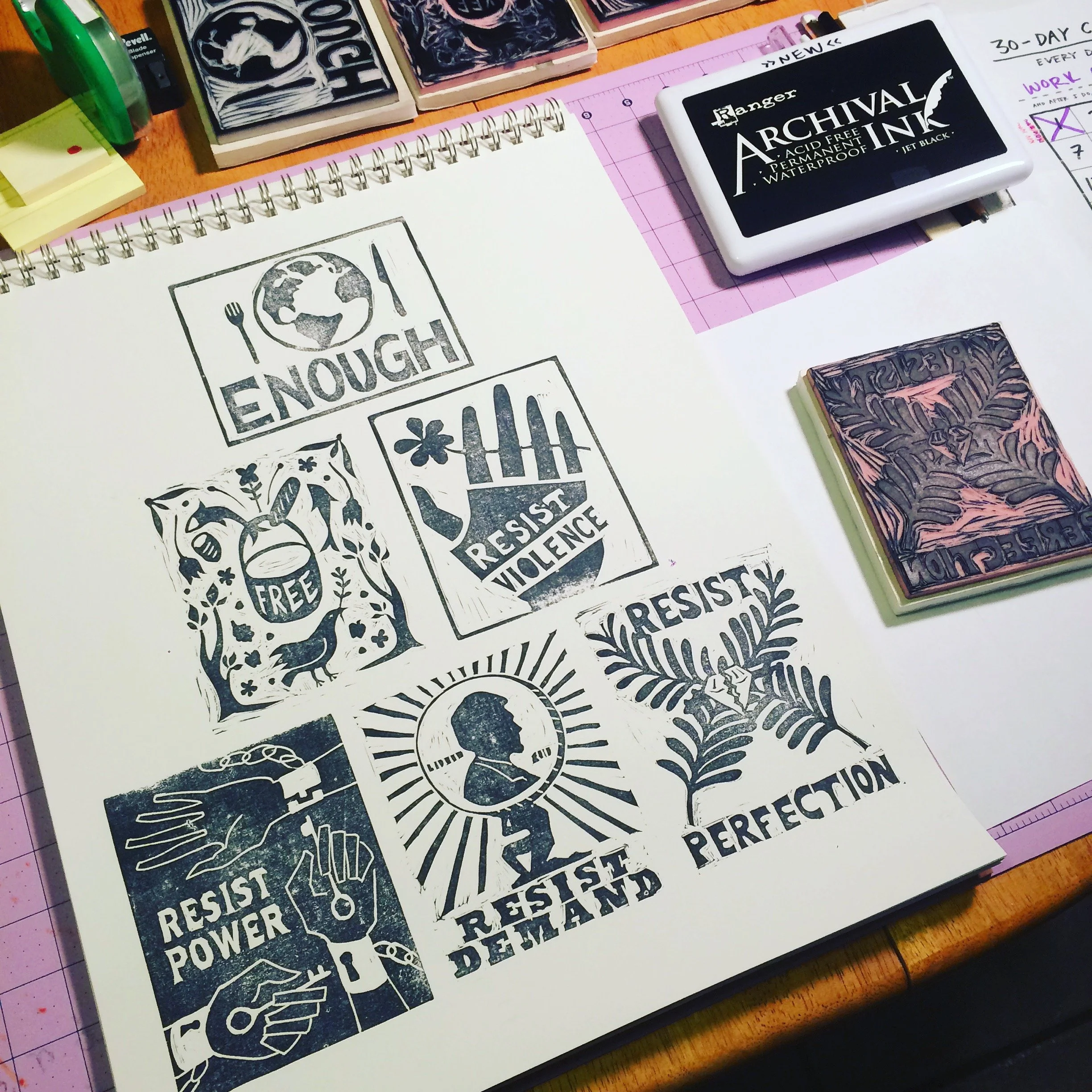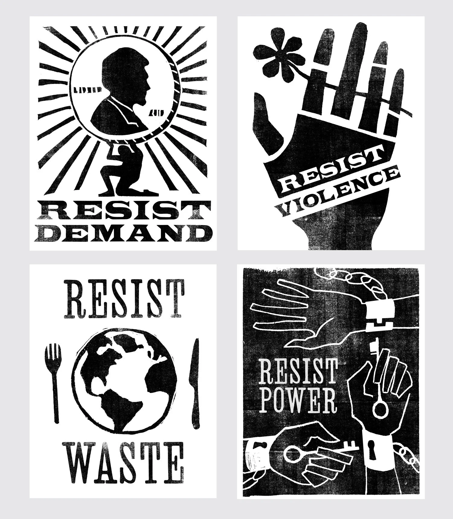 In the spirit of protest posters, the illustrations were first made as hand-carved stamps. The designs were then re-tweaked in Photoshop for a larger, poster-sized format. The typography is derived from a vintage wood-type catalogue book.