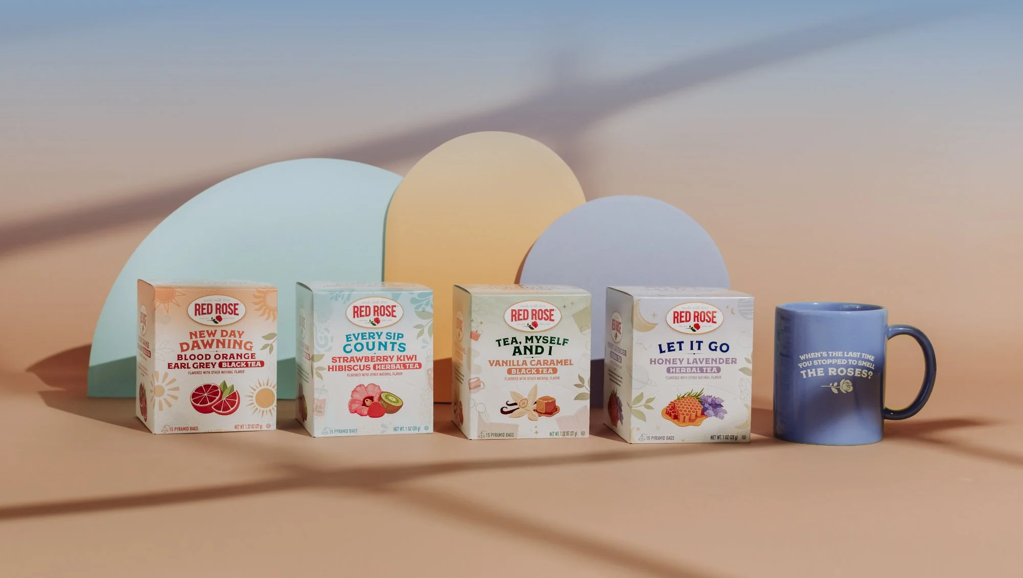 Red Rose Moments is a line of premium pyramid bag teas, each flavor encapsulating a moment of pause to enjoy life. The cartons were beautifully designed by Works Design Group. Each flavor has a different set of illustrations echoing the moment of that flavor. The launch project’s goal was to emphasize taking time to “drink in every moment”.